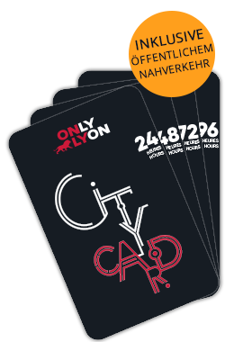 Mit der Lyon City Card (außer dematerialisierte Karte) können Sie ein besonderes Angebot des Fahrradverleihsystems vélo‘v nutzen, das es Ihnen ermöglicht für nur 5€ die vélo’v-Fahrräder 3 Tage lang zu benutzen. Außerdem werden Ihnen 60 Minuten bei jeder Fahrradnutzung geschenkt. Aktivieren Sie Ihr Ticket mit Ihrer Lyon City Card an einem vélo’v-Automaten, im Lyon Tourismus- und Kongressbüro oder gehen Sie auf www.velov.grandlyon.com.